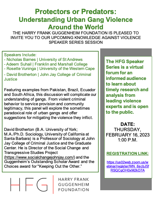 The Harry Frank Guggenheim Foundation (HGF) is pleased to invite you to our upcoming Knowledge Against Violence Speaker Series session. The HFG Speaker Series is a virtual forum for an informed audience to learn about timely research and analysis from leading violence experts and is open to the public.